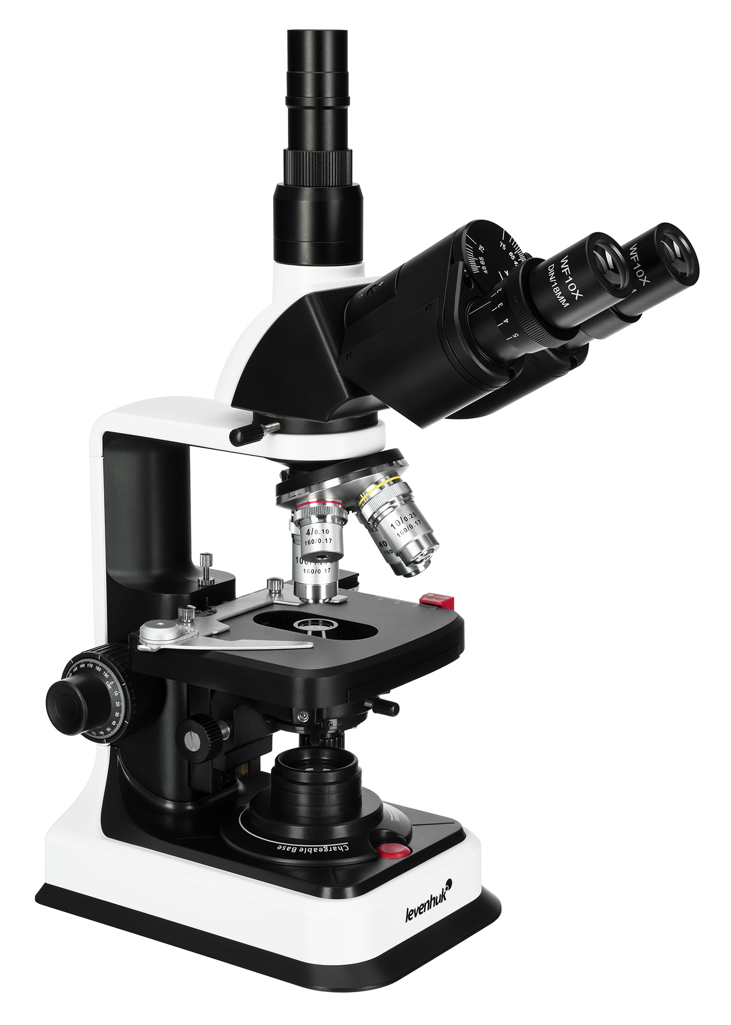 Визуальная насадка имеет угол наклона 30° и может быть развернута в наиболее удобное для работы положение в диапазоне от 0° до 360°. В конструкции использованы широкопольные окуляры WF10x/18 мм с посадочным диаметром 23,2 мм. Для пользователей с особенностями зрения и носящих очки предусмотрена функция диоптрийной подстройки ±5 D, которая усиливает удобство использования прибора и снижает нагрузку на глаза при длительных наблюдениях. В револьверном устройстве микроскопа установлены 4 ахроматических объектива на 4, 10, 40 и 100 крат; такая оптика обеспечит стабильно ясное, четкое и правдивое изображение без аберраций, искажений и виньетирования. Объективы 40х и 100х – подпружиненные, а объектив 100х также может использоваться для масляной иммерсии.