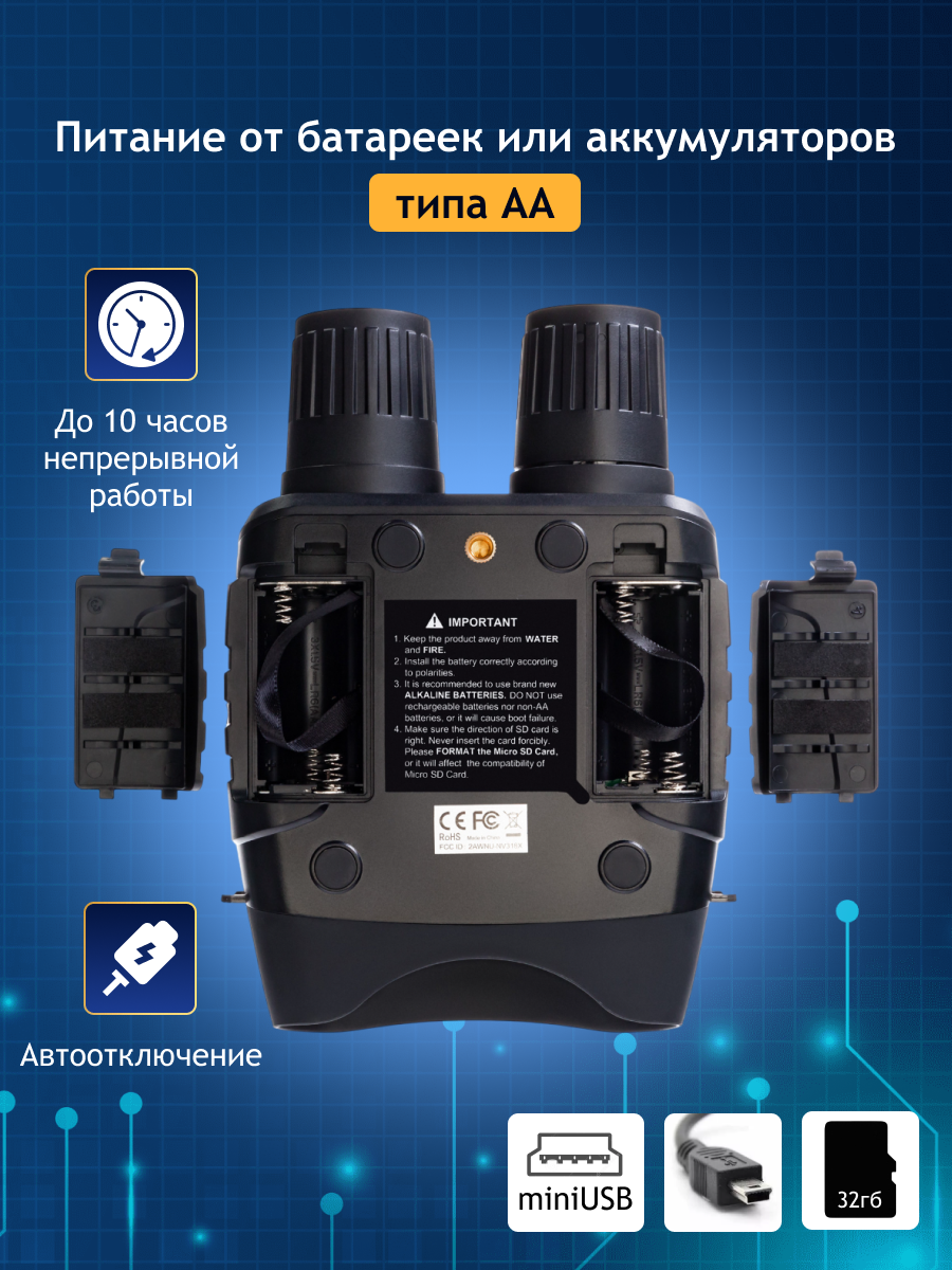 Эргономичный пластиковый корпус с нескользящей поверхностью удобно и надежно лежит в руках, позволяя легко и быстро дотянуться до любой кнопки управления. Прибор имеет защиту от брызг. Для питания электронных компонентов используются стандартные батарейки. Это удобнее, чем аккумуляторы, так как в полевых условиях гораздо проще заменить батарейки, чем подзарядить севший аккумулятор. На одном заряде ПНВ может работать от 4 до 10 часов, длительность работы зависит от интенсивности использования подсветки.
