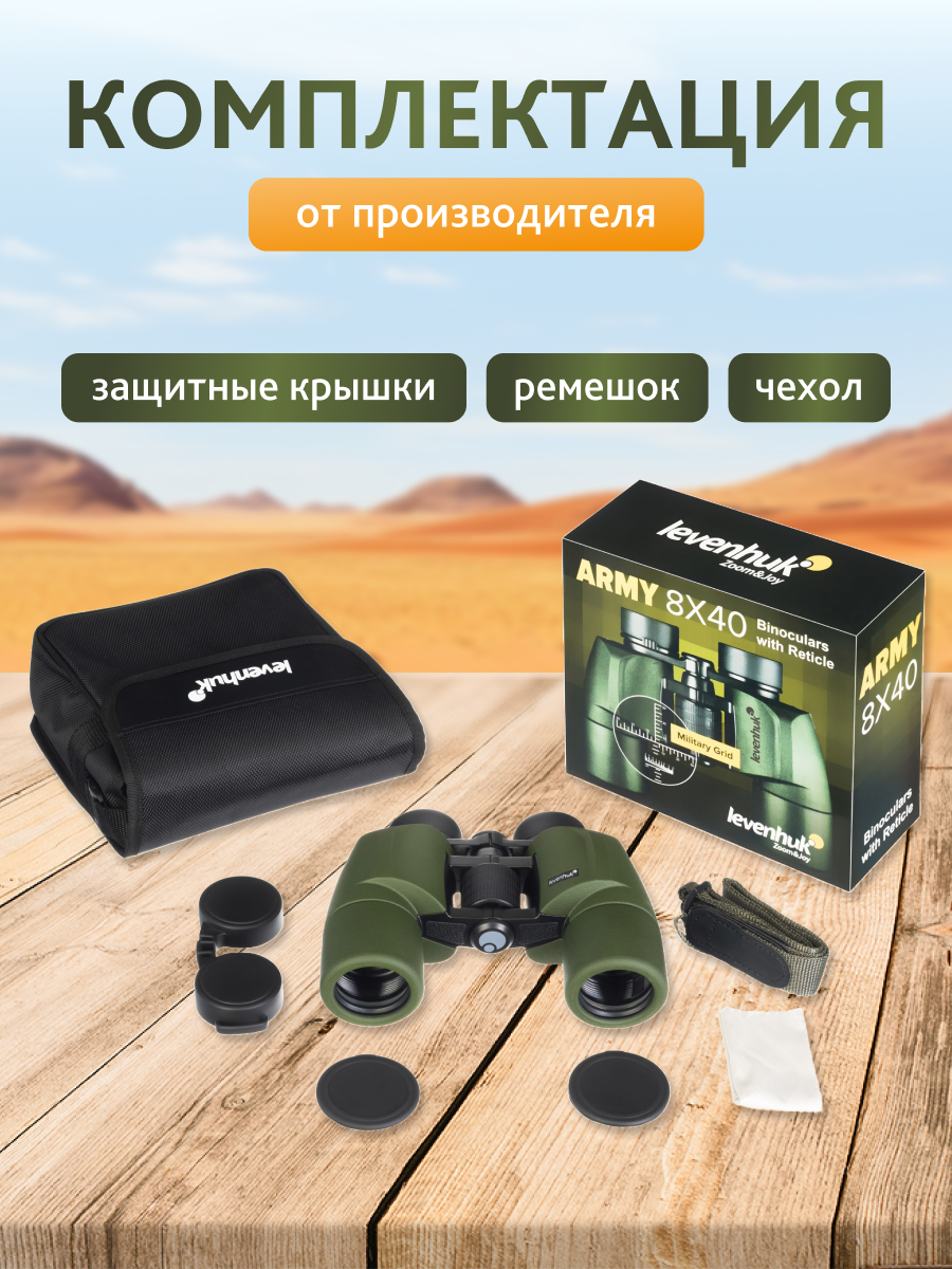 Представляем Levenhuk Army 8x40 с сеткой – бинокль, в котором предусмотрено все необходимое для эффективных наблюдений в полевых условиях. Он отлично проявит себя на охоте и рыбалке, в многодневном походе и на тактической игре. В одном из окуляров прибора есть две измерительные шкалы, с помощью которых можно определять несколько параметров: дистанцию до наблюдаемого объекта, его высоту, углы (вертикальные и горизонтальные). Еще одно преимущество бинокля – широкое поле зрения: одним взглядом можно окинуть протяженную область. Это особенно удобно, если вы наблюдаете за движущимися целями: группами людей, автотранспортом и проч.