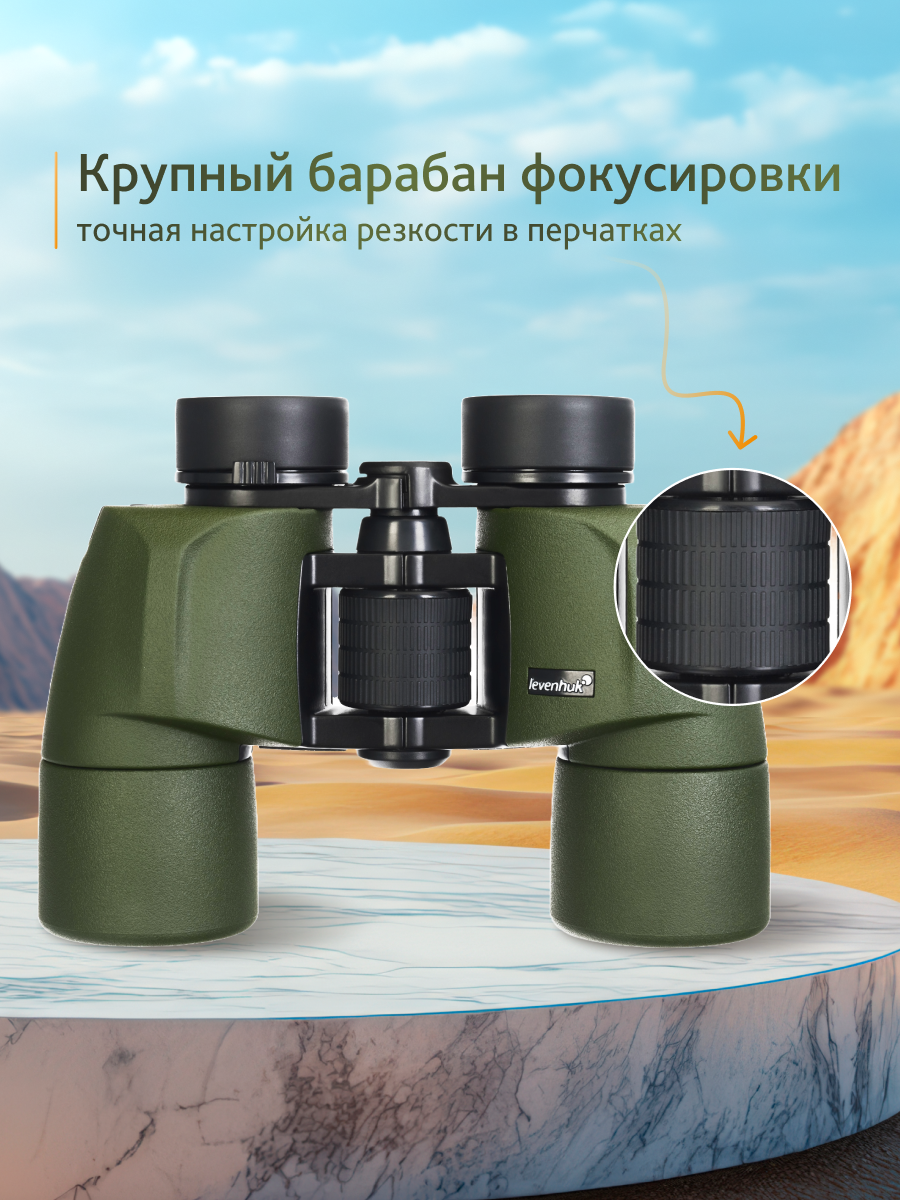 Основа оптической системы бинокля Levenhuk Army 8x40 – полноразмерные призмы Porro. Высококачественное стекло BaK-4 покрыто полным многослойным просветлением, благодаря чему оптика формирует яркое, контрастное, отчетливое изображение. Сфокусироваться можно на объектах всего в 3 метрах от наблюдателя, настройка резкости производится на обоих объективах одновременно с помощью крупного барабана по центру. Поворотно-выдвижные наглазники, большой вынос зрачка и диоптрийная коррекция позволяют быстро подстроить бинокль под зрение любого пользователя и вести наблюдения, не снимая солнцезащитных очков или тактической маски.