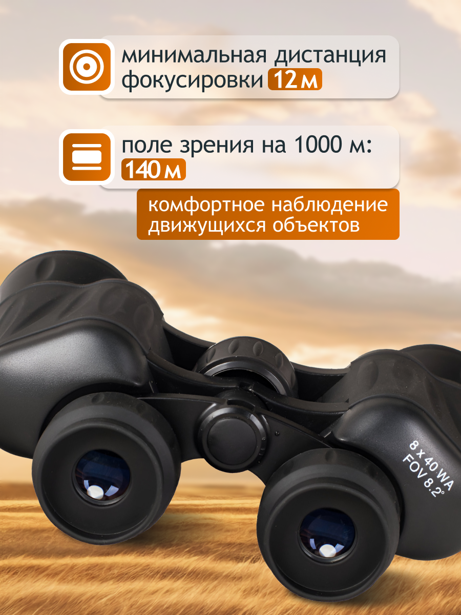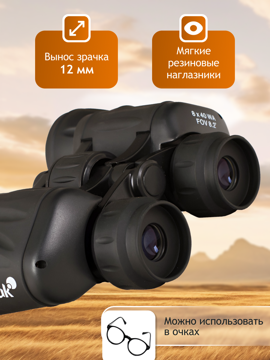 • Классический бинокль на призмах Порро с диаметром объективов 40 мм и увеличением 8 крат