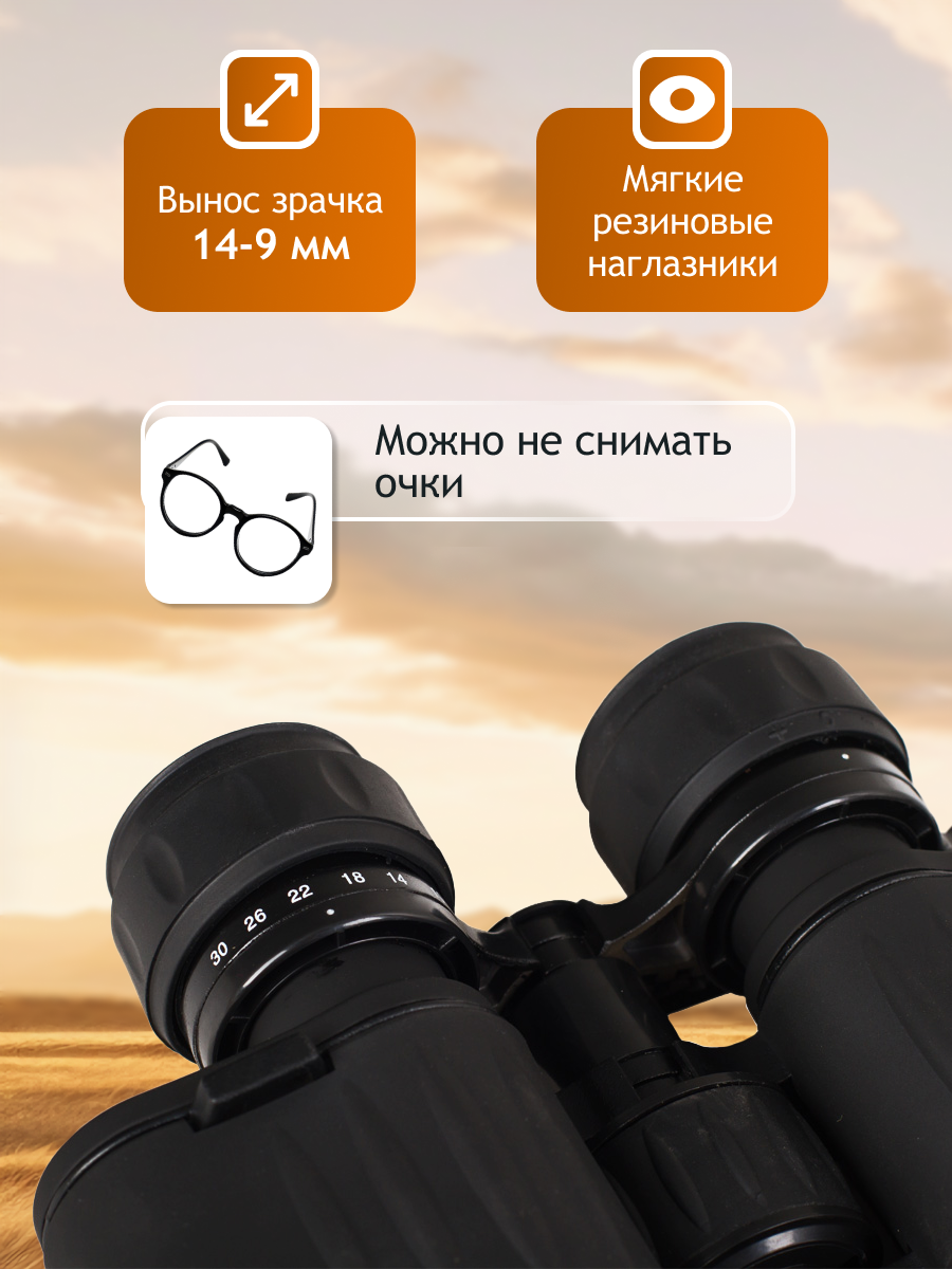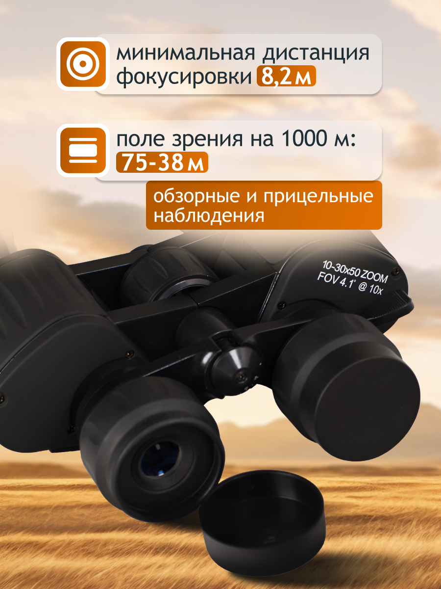 • Бинокль классического форм-фактора с переменной кратностью 10–30x, апертура 50 мм