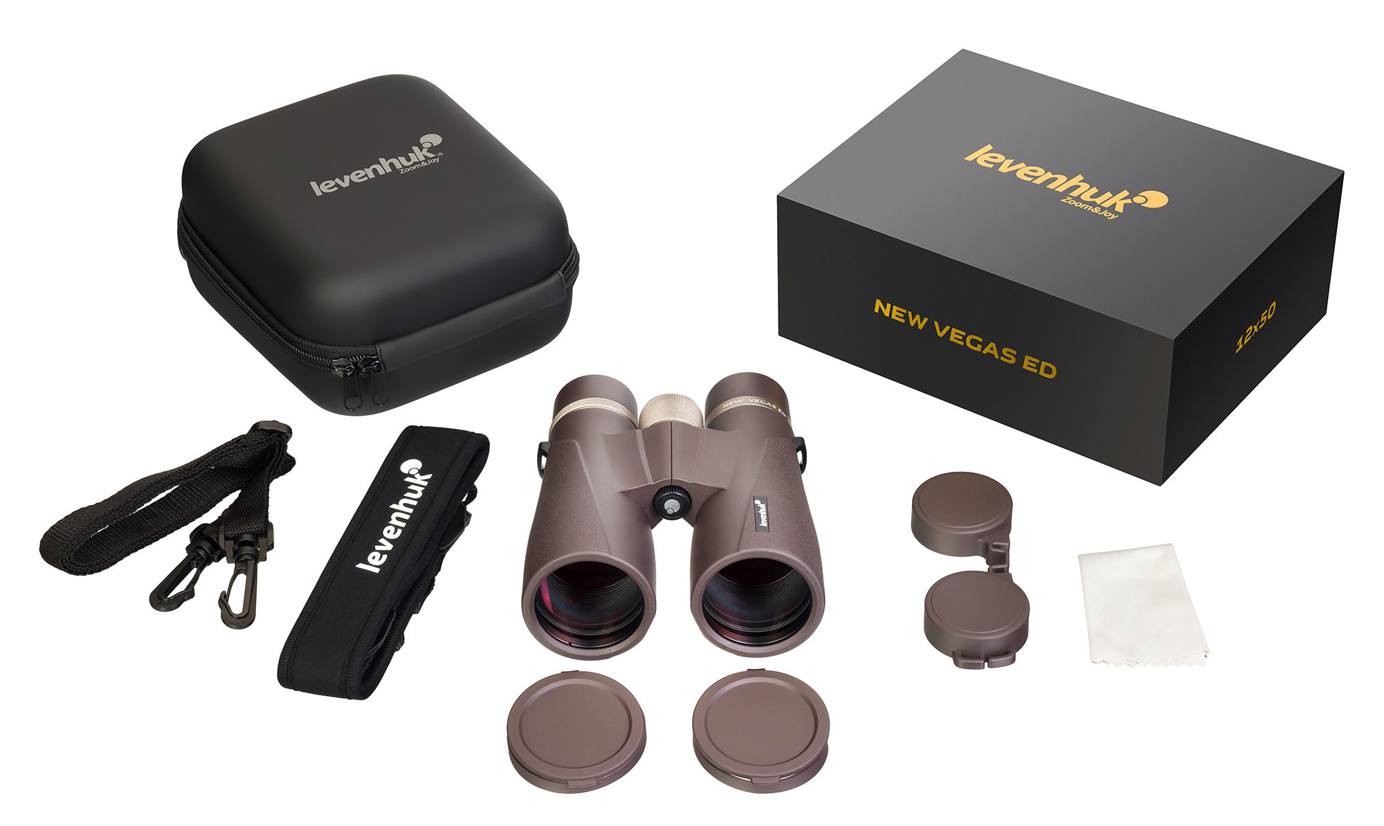 Levenhuk New Vegas ED 12x50 – это гарантированно яркая, четкая и «живая» картинка в любых условиях наблюдений. Линзовые элементы в схеме бинокля изготовлены из высококачественного ED-стекла, не подверженного хроматическим аберрациям, а призмы – из оптического стекла марки BaK-4, известного высоким светопропусканием. Особое строение окуляров, состоящих из пяти элементов в трех группах, добавляет изображению реалистичности. Оптическая схема основана на современных roof-призмах, повлиявших и на конструкцию бинокля – благодаря им корпус прибора удалось сохранить относительно компактным, удобным в транспортировке и эксплуатации в походных условиях, часто сопряженных с различными неудобствами и трудностями.