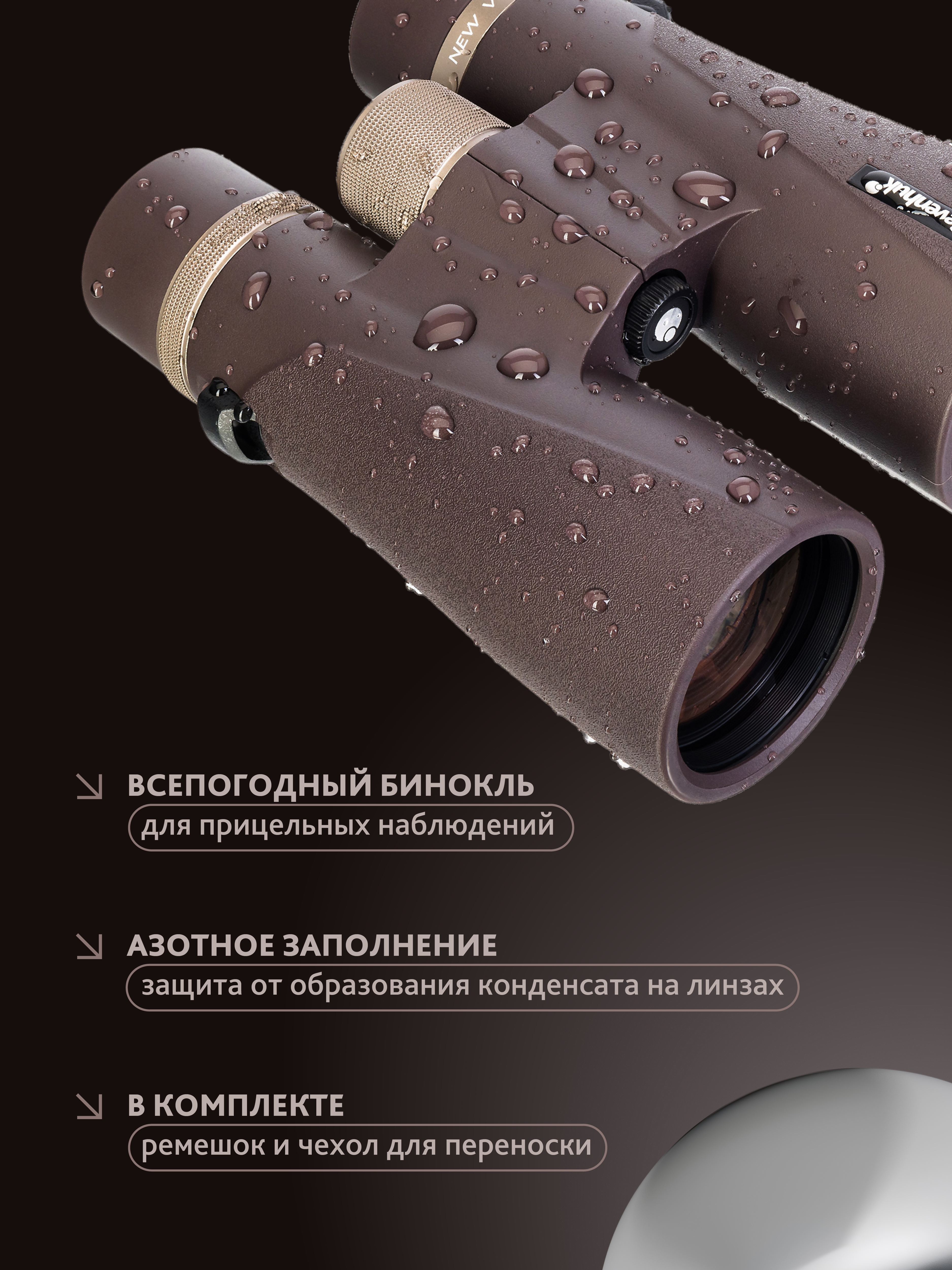 Бинокль Levenhuk New Vegas ED 12x50 – пример надежного всепогодного инструмента, который не подведет даже в центре бушующей стихии. Его корпус изготовлен из ударопрочного и долговечного алюминиево-магниевого сплава, герметизирован от пыли, грязи и воды по стандарту IP67 и заполнен азотом, предотвращающим запотевание линз при скачках внешней температуры и тормозящим окислительные процессы. Бинокль без труда выдержит даже падение в водоем на глубину до 1 метра, а значит с ним можно работать не только на суше, но и у рек и озер.