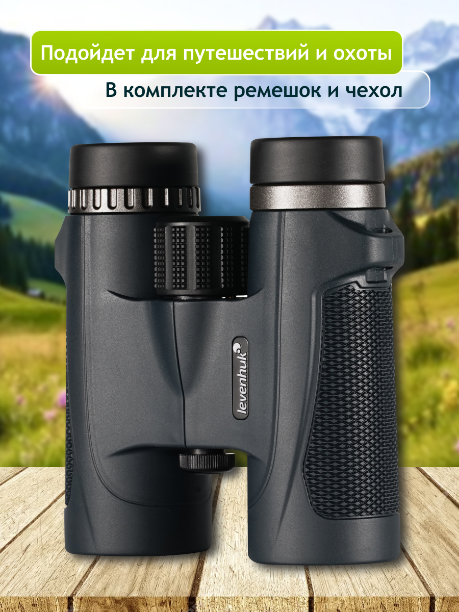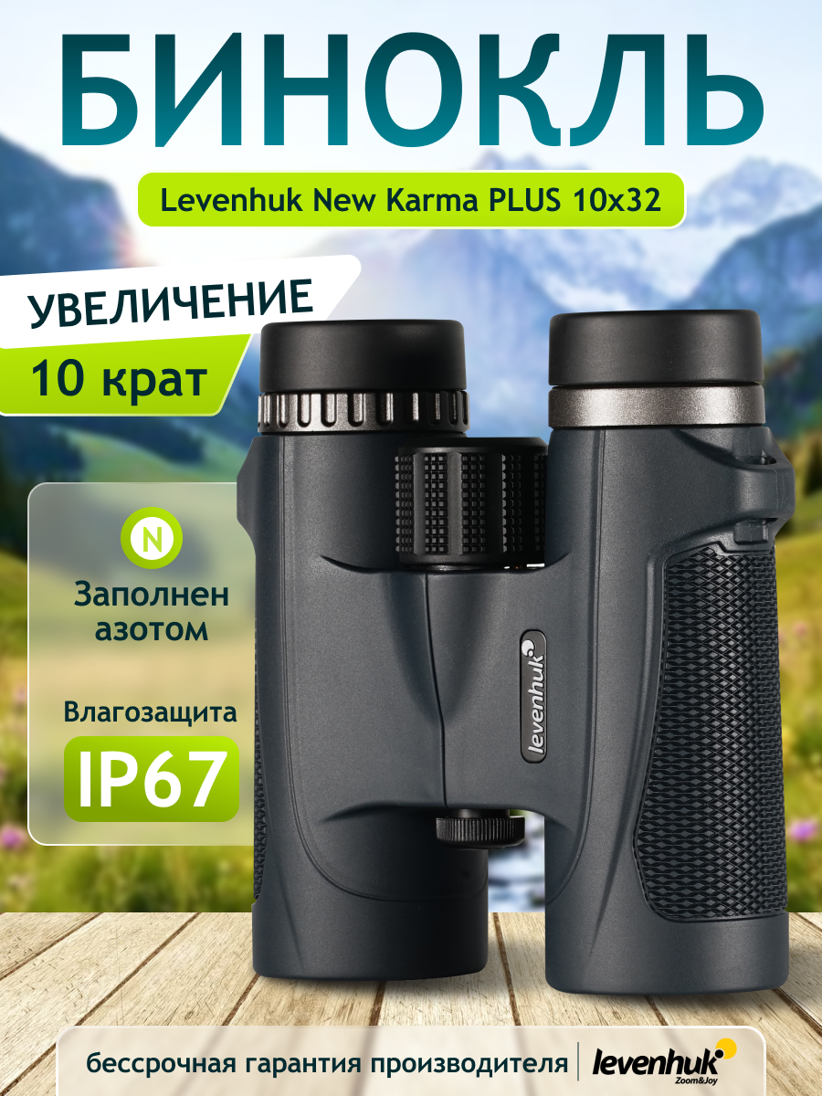 Бинокль Levenhuk New Karma PLUS 10x32 подходит для использования в походных и полевых условиях и применяется для ведения наблюдений за дикой природой и изучения местности на средних и дальних дистанциях. Этот прибор станет отличным помощником в ситуациях, когда необходимо продолжать работу, невзирая на сложные окружающие условия: сумерки, пасмурную погоду и недостаток дневного света, идущие дождь или снег. Бинокль герметизирован по стандарту IP67, защищен от пыли и влаги, а также может свободно использоваться рядом с водоемами – ему не повредит случайное падение в воду на глубину до 1 метра.