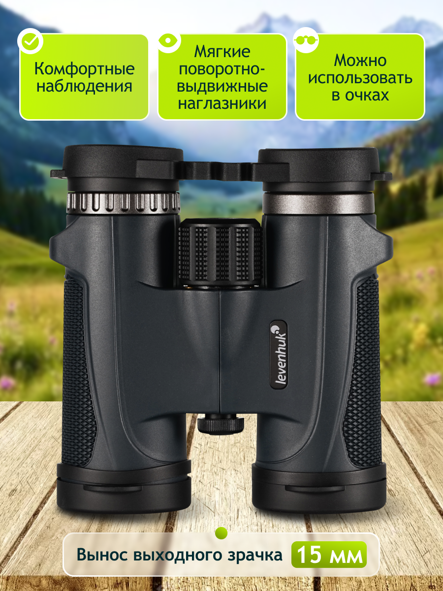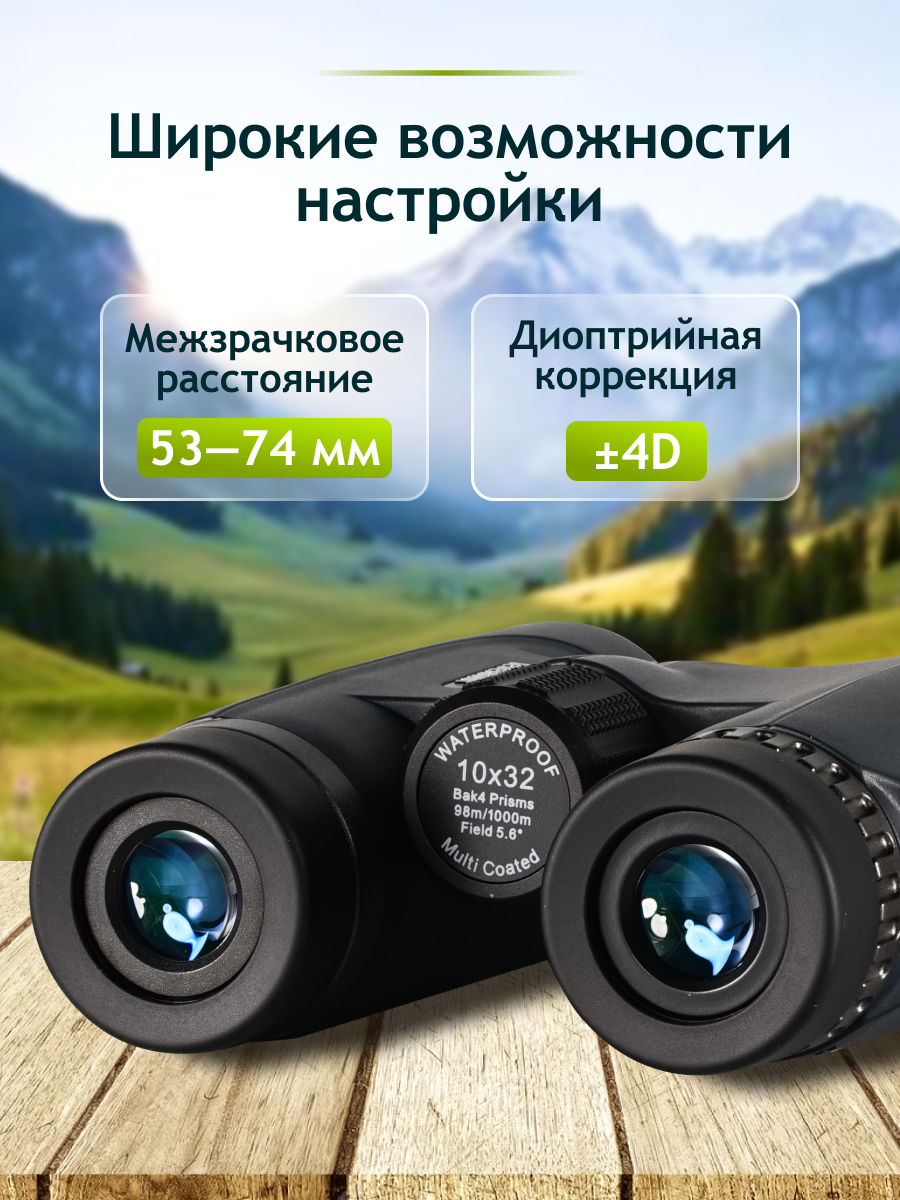 Увеличение Levenhuk New Karma PLUS 10x32 составляет 10 крат, а поле зрения – 5,6°, что является идеальным сочетанием для ведения обзорных наблюдений за более удаленными участками местности и объектами на них. Некоторые параметры бинокля пользователь может настроить под себя: например, межзрачковое расстояние – в пределах 53–74 мм; диоптрии – коррекция возможна от –4 до +4 D. Дополнительно улучшает картинку многослойное просветляющее покрытие на линзах и призмах: оно делает наблюдаемое изображение более четким, светлым и правдоподобным.