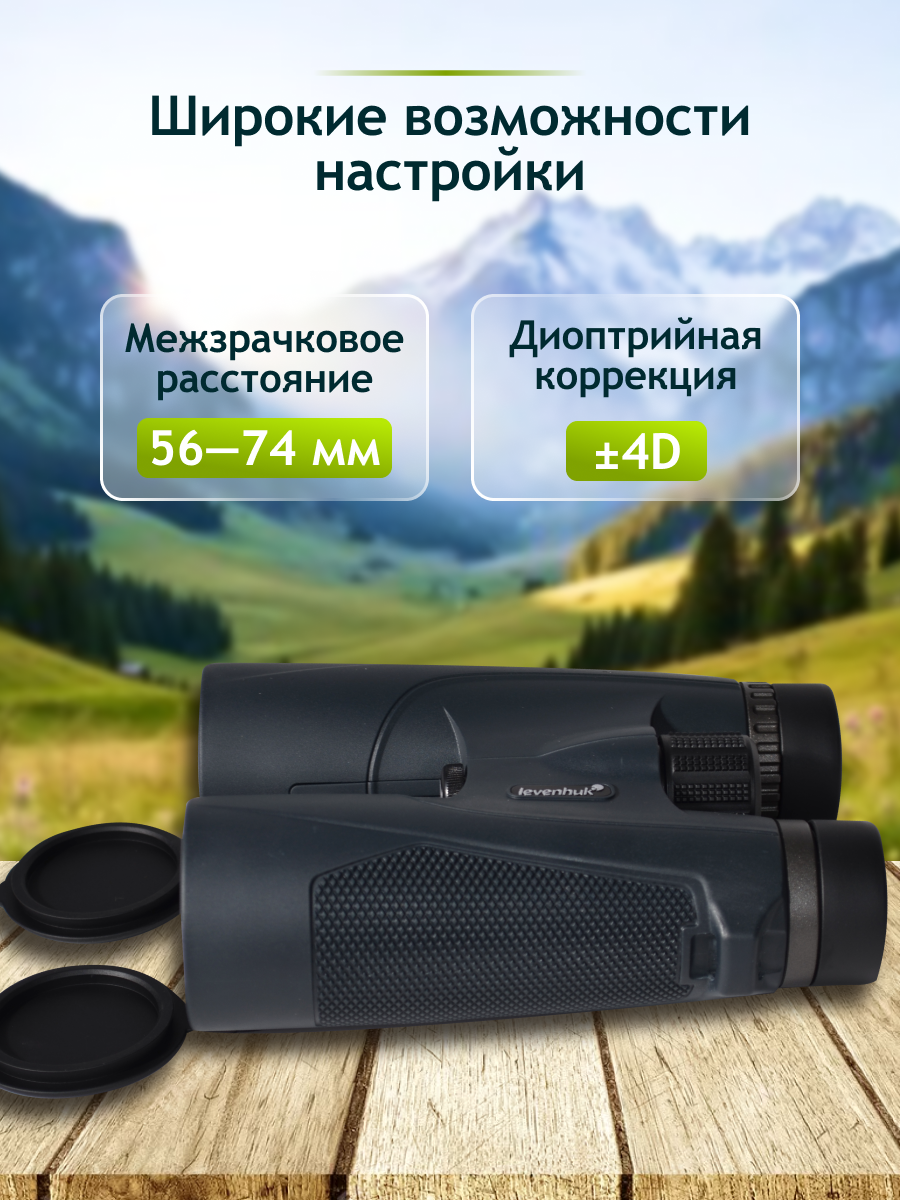 Бинокль можно установить на штатив, используя предусмотренную в корпусе резьбу стандарту 1/4" – это позволит сделать длительные наблюдения в одном направлении гораздо комфортнее. Также можно изменить межзрачковое расстояние, отрегулировав его под индивидуальные физиологические особенности в диапазоне от 56 до 74 мм. Имеется и функция диоптрийной подстройки – от –4 до +4 D.
