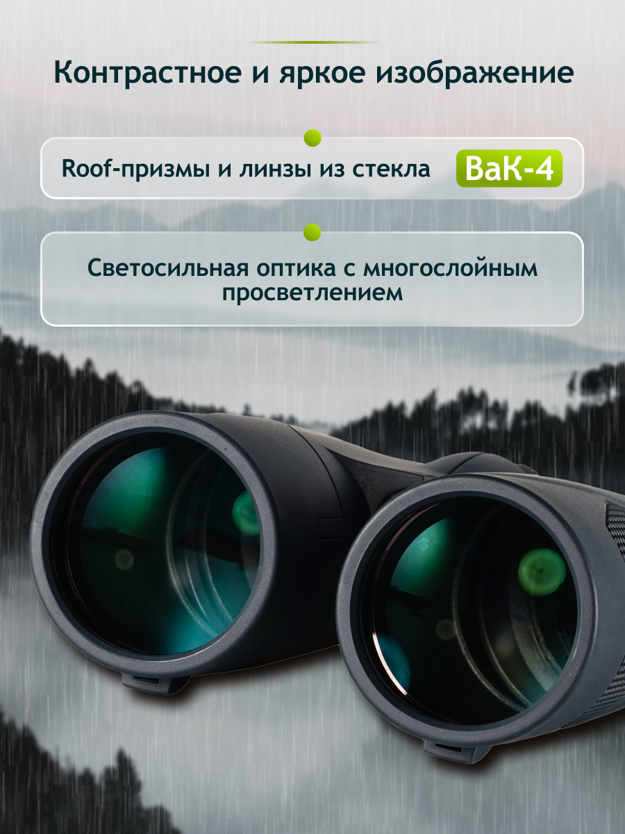 Levenhuk New Karma PLUS 10x50 превосходно защищен от воздействия пыли, воды, песка и грязи – его корпус герметизирован по стандарту IP67. Бинокль можно без опаски использовать рядом с водоемами – он выдержит кратковременное погружение в воду, если вы случайно выроните прибор. Но шансы этого сведены к минимуму: снаружи корпус бинокля покрыт резиновым напылением, сохраняющим надежное сцепление с ладонями и пальцами, даже если они полностью промокли под дождем.